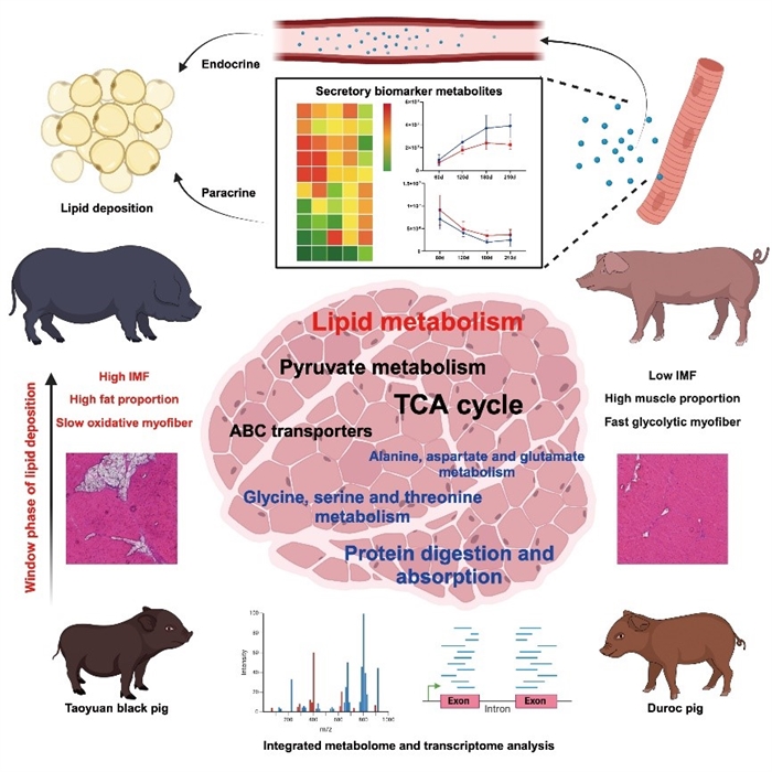 中國是世界上最大的豬肉生產(chǎn)和消費(fèi)國。桃源黑豬原產(chǎn)于湖南省桃源縣,是中國特有的脂肪型地方品種豬,與瘦肉型杜洛克豬相比,具有更高的肌內(nèi)脂肪含量和慢肌纖維占比,以優(yōu)良的肉品質(zhì)著稱,同時具有更豐富的外周脂肪沉積。調(diào)控桃源黑豬的脂肪沉積,在降低外周脂肪的同時提高肌內(nèi)脂肪含量,具有較高的經(jīng)濟(jì)價值。同時,挖掘和利用我國地方豬種質(zhì)資源,對實現(xiàn)種業(yè)振興具有重要的意義。肌肉和脂肪組織同時是重要的代謝和分泌器官,肌肉和脂肪組織之間通過分泌因子進(jìn)行對話,也被稱為“肌-脂互作軸”。分泌型代謝物作為肌-脂互作的重要媒介,能夠調(diào)控肌肉分化、代謝穩(wěn)態(tài)和脂肪沉積。因此,桃源黑豬和杜洛克豬也是研究肌-脂互作機(jī)制和代謝性疾病的理想動物模型。