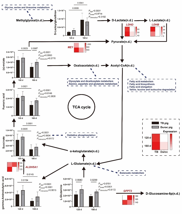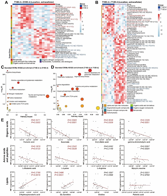 該研究通過對不同日齡桃源黑豬和杜洛克豬的背最長肌組織進(jìn)行非靶向代謝組學(xué)分析,結(jié)合脂肪沉積表型數(shù)據(jù),研究人員首先確定了桃源黑豬脂肪沉積和肉品質(zhì)形成的“窗口期”為120至180日齡。代謝組與轉(zhuǎn)錄組聯(lián)合分析揭示“窗口期”日齡與品種間背最長肌代謝差異主要富集在能量、脂質(zhì)和氨基酸蛋白質(zhì)代謝相關(guān)通路。隨后鑒定了數(shù)十種180日齡桃源黑豬背最長肌的特異性代謝產(chǎn)物。