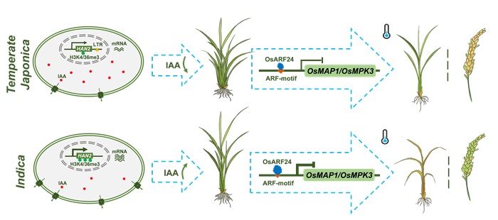 中國科學(xué)院亞熱帶農(nóng)業(yè)生態(tài)研究所聯(lián)合多家單位在Nature Communications發(fā)表題為Suppressing an auxin efflux transporter enhances rice adaptation to temperate habitats的研究論文,闡述生長素外排轉(zhuǎn)運蛋白HAN2/OsABCB5通過生長素信號通路調(diào)控水稻低溫環(huán)境適應(yīng)性的分子機制。該研究獲得兩個新發(fā)現(xiàn):① 生長素轉(zhuǎn)運及其信號通路調(diào)控水稻低溫環(huán)境適應(yīng)性的遺傳基礎(chǔ),② Copia逆轉(zhuǎn)座子介導(dǎo)的表觀遺傳修飾驅(qū)動秈粳適應(yīng)性分化的分子機制,為培育氣候韌性水稻品種提供新的理論依據(jù)與基因資源。