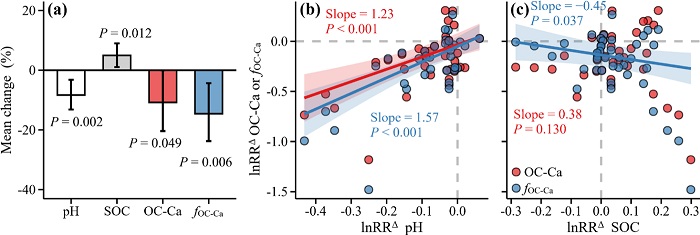 研究發(fā)現(xiàn),OC-Ca約占SOC庫(kù)的 8%,且在旱區(qū)和農(nóng)田生態(tài)系統(tǒng)儲(chǔ)量最為豐富。融合多層次與探索性統(tǒng)計(jì)分析,結(jié)果表明,全國(guó)尺度土壤無(wú)機(jī)碳是預(yù)測(cè)OC-Ca積累的主導(dǎo)因子。水分通過(guò)調(diào)節(jié)土壤pH和碳酸鹽沉淀,間接驅(qū)動(dòng)OC-Ca的空間格局。相比之下,交換性鈣與OC-Ca的關(guān)聯(lián)較弱,甚至呈負(fù)相關(guān),這挑戰(zhàn)了傳統(tǒng)觀點(diǎn)。研究還表明,盡管氮富集促進(jìn)了SOC儲(chǔ)存,但卻導(dǎo)致OC-Ca庫(kù)的損失。這一發(fā)現(xiàn)凸顯了氮富集可能削弱SOC穩(wěn)定性的潛在風(fēng)險(xiǎn),為評(píng)估全球變化的生態(tài)后果提供了關(guān)鍵科學(xué)依據(jù)??偟膩?lái)說(shuō),這項(xiàng)工作將土壤無(wú)機(jī)碳(碳酸鹽)與特定SOC組分的固存聯(lián)系起來(lái),強(qiáng)調(diào)了其在SOC固持和穩(wěn)定中長(zhǎng)期被忽視的貢獻(xiàn)。研究成果不僅深化了對(duì)SOC穩(wěn)定機(jī)制的理解,也為制定針對(duì)性的土壤固碳管理策略提供了理論支撐。