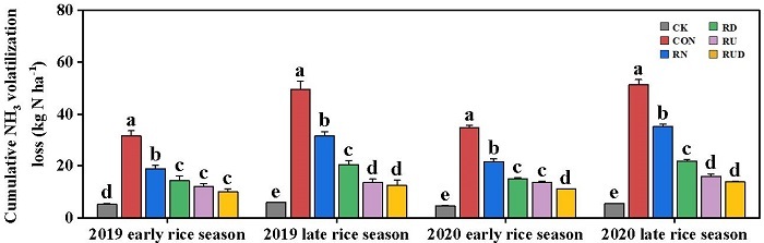 圖1 不同氮素管理措施下雙季稻田NH3揮發(fā)累計(jì)排放量