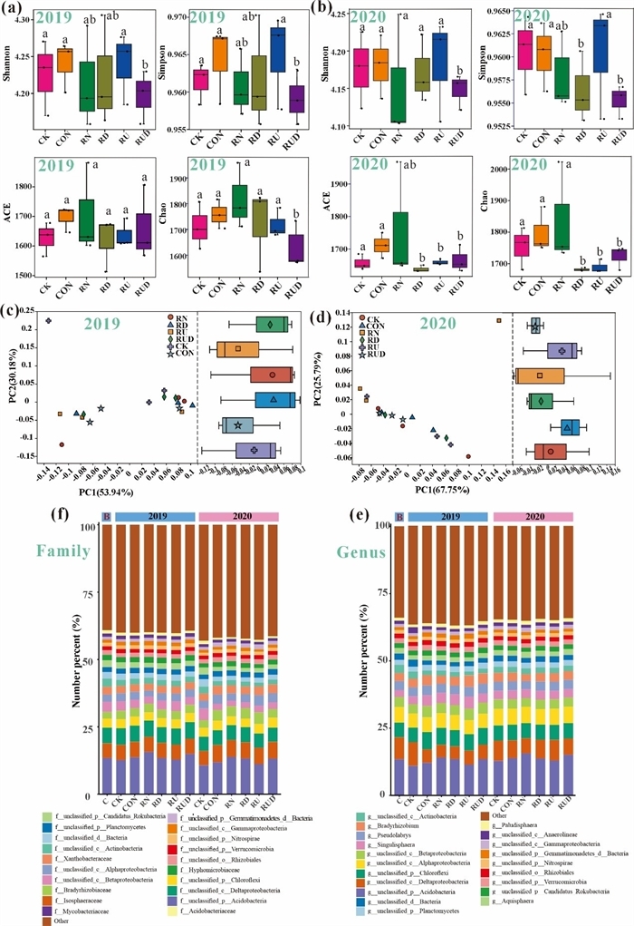 (a)和(b):六種處理方式下的土壤微生物α多樣性指標(biāo)(Shannon, Simpson, Chao1, ACE指數(shù));(c)和(d):微生物群落組成的主坐標(biāo)分析(PCoA);(e)和(f):不同處理方式下優(yōu)勢微生物分類群(屬水平和科水平)的相對豐度。