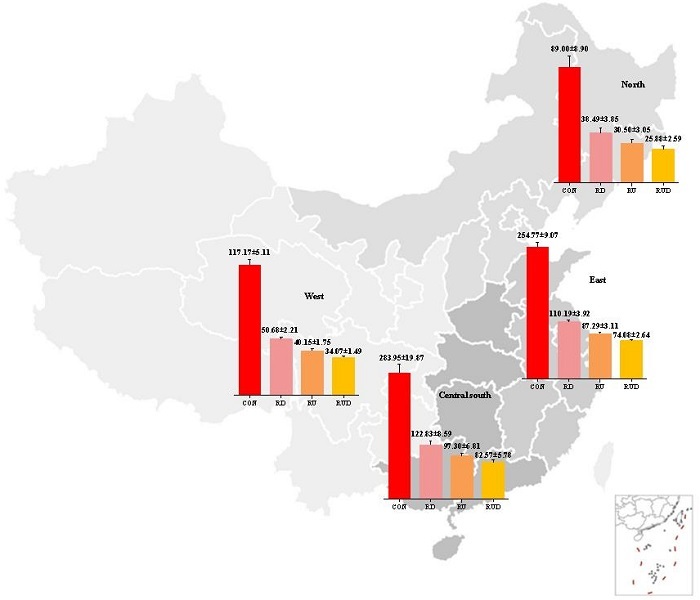 圖3 中國各區(qū)域氨排放及各減排措施的減排潛力估算