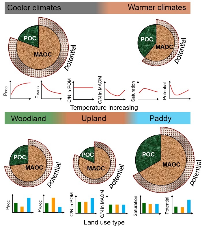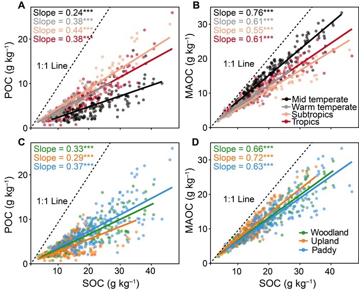 中國科學院亞熱帶農(nóng)業(yè)生態(tài)研究所流域農(nóng)業(yè)環(huán)境研究中心陳香碧研究員小組從我國東部四個氣候帶(中溫帶-黑土、暖溫帶-潮土、亞熱帶-紅壤和熱帶-磚紅壤)采集240組鄰近林地、旱地和水田土壤樣品,采用粒徑分級技術(shù),量化了顆粒態(tài)有機碳(POC)和礦物結(jié)合態(tài)碳(MAOC)對土壤總碳的貢獻,進一步采用邊界線法估算了MAOC飽和水平及固持潛力。結(jié)果發(fā)現(xiàn):土壤總有機碳含量以南方(亞熱帶和熱帶)低于北方(中溫帶和暖溫帶),且每個氣候帶總體表現(xiàn)為稻田>林地>旱地。所有土壤有機碳庫組成均以MAOC(60%~77%)為主,但南方土壤MAOC對總有機碳的貢獻(58%)低于北方(69%)。農(nóng)業(yè)土地利用重塑了土壤有機碳庫組成及其穩(wěn)定性:與自然林地相比,水田土壤POC和MAOC含量均更高,但其碳庫穩(wěn)定性低(低MAOC/POC比值);旱地土壤POC和MAOC含量均更低,但碳庫穩(wěn)定性強(高MAOC/POC比值)?;谕寥垃F(xiàn)時MAOC含量與黏粉粒含量的95th分位數(shù)回歸結(jié)果發(fā)現(xiàn),四個氣候帶農(nóng)田土壤MAOC積累均尚未達到飽和,主要歸因于農(nóng)田土壤有機碳輸入量不足,而非礦物活性位點限制。當前,土壤MAOC平均飽和水平約60%,但不同樣本間土壤MAOC飽和水平變異較大,說明我國農(nóng)田土壤固碳潛力大、提升空間可觀。本研究強調(diào),提升土壤有機碳庫的管理策略必須因地制宜,充分考慮當?shù)赝恋乩梅绞?、氣候條件、土壤碳庫組成及其飽和水平。