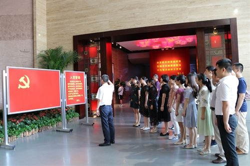 在陳列館大廳,大家面向黨旗舉起右手,一起重溫入黨誓詞。