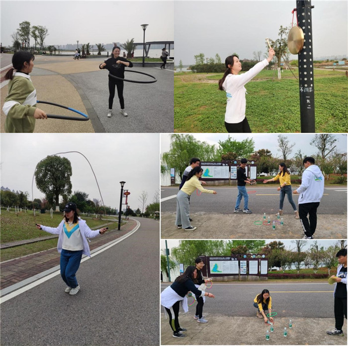 活動(dòng)在徒步途中設(shè)置了詞語猜謎、呼啦圈、跳繩、套圈以及蒙眼敲鑼五個(gè)趣味活動(dòng)。