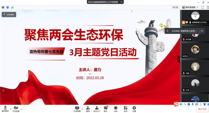 會(huì)上,組織觀看了“焦點(diǎn)訪談:聚焦兩會(huì),生態(tài)優(yōu)先,綠色發(fā)展”的視頻,組織集中學(xué)習(xí)2022年“兩會(huì)”政府工作報(bào)告中關(guān)于生態(tài)相關(guān)的內(nèi)容,并圍繞高質(zhì)量發(fā)展與高水平保護(hù)的辯證統(tǒng)一關(guān)系進(jìn)行討論。唐力分享了各地代表團(tuán)結(jié)合自身資源稟賦,加快推動(dòng)落實(shí)“雙碳”戰(zhàn)略步伐的建議,并結(jié)合自身學(xué)習(xí)情況與大家分享了學(xué)習(xí)心得。