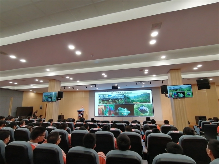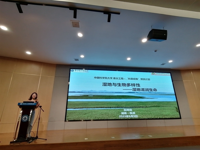 針對青龍灣中學初一年級師生,張浩研究員以《石漠化知多少》為題,介紹了石漠化現象和概念,形成的自然因素和社會因素,最后詳細闡述石漠化綜合治理措施及生態(tài)效應和社會影響;張娉楊特聘研究助理以《濕地與生物多樣性-濕地滋潤生命》為題,以洞庭湖濕地為切入點介紹了濕地的概念和功能,濕地生態(tài)相關科學問題,分享課題組在洞庭湖如何開展科研工作等內容。