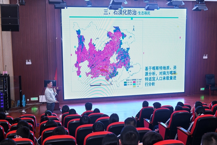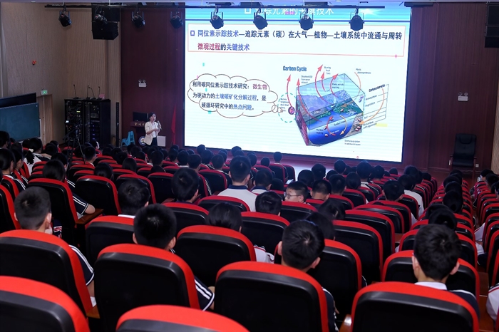 在懷化市金時(shí)中學(xué),袁紅朝正高級工程師作題為《雙刃劍:小小元素的大能量》的科普報(bào)告,元素作為物質(zhì)的基本單位,其微觀能量既可推動文明,也可能引發(fā)危機(jī)作為,報(bào)告還回顧一批杰出科學(xué)家以愛國奉獻(xiàn)、自主創(chuàng)新精神,助力中國核能事業(yè)崛起的故事;張浩研究員作題為《石漠化:土地的“石化”之謎與綠色復(fù)蘇計(jì)劃》的報(bào)告,介紹了我國南方石漠化分布情況及危害,剖析自然與社會成因,并從生態(tài)移民、植被復(fù)合經(jīng)營、生態(tài)產(chǎn)業(yè)等方面展示石漠化治理成效。