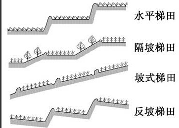 梯田是人們對(duì)自然地形的改變。按田面坡度不同而有水平梯田、坡式梯田、復(fù)式梯田等。水平梯田是最常見的一種梯田,其耕作地塊是水平的,保水、保土、增產(chǎn)效果較好。坡式梯田坡面上地埂呈階梯狀,而地塊呈斜坡。坡式梯田是為了減少水土流失量,在適當(dāng)位置壘石筑埂,并逐步加高,地塊內(nèi)坡度逐步減小,從而增加地表徑流的下滲量,減少地面沖刷,有條件時(shí)即可改造為水平梯田。反坡梯田是坡式梯田的一種特殊形式,坡面外高內(nèi)低,能改善立地條件,蓄水保土,適用于干旱及水土沖刷較重而坡行平整的山坡地及黃土高原,但修筑較費(fèi)工。復(fù)式梯田指因山就勢、因地制宜在山丘坡面上開辟的水平梯田、坡式梯田、隔坡梯田等多種形式的梯田組合,還可配合水平溝等水土保持工程,以提高坡面耕地的保水抗蝕能力,復(fù)式梯田可更合理地利用土地,節(jié)省工程投資和提高水土保持效益。另外還有一種水平梯田和自然坡地相結(jié)合的隔坡梯田,即上一階梯田與下一階梯田之間保留一定的原始坡地。水平梯田上種作物,坡地上種草、集水。水平梯田與坡地兩帶寬度比一般為1:1。