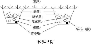 滲濾溝主要由五部分組成,從上自下分別為表層、滲濾層、隔離層、底層和防滲層。表層:由較肥沃的耕作土壤組成,是草坪植物的生長層,實現(xiàn)污水綠地利用;滲濾層:是土壤攙和一定比例的泥炭和爐渣配制而成的特殊土壤層,實現(xiàn)污水凈化;隔離層:由可透水的無紡布構成,以防止上層土壤下落填入礫石層,破壞均勻布水;底層:又稱布水層或墊層,由礫石和粗砂組成,起承托滲濾層和使污水均勻分布的作用,內設布水管;防滲層:由聚氯乙烯薄膜構成,其作用是防止污水直接下滲,使礫石層經常處于水飽和狀態(tài),促使水分的毛細上升。其中滲濾層的特殊土壤具有理想的土壤有機質組成,有機質含量豐富,團粒結構發(fā)達,滲透速率高,毛細作用強,吸附容量大,通透性較好。同時,土壤中富含微生物所必須的營養(yǎng)和能源物質,加之適宜的土壤性狀為土壤微生物提供了良好的生存發(fā)育環(huán)境,因此土壤具有較高的生物活性。