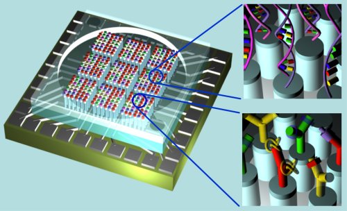 基因芯片的基本原理也就是利用基因互補(bǔ)配對(duì)的原則,在一個(gè)載體上來(lái)進(jìn)行基因檢測(cè),實(shí)際上是一個(gè)高密度的雜交技術(shù)?;蛐酒夹g(shù)包括幾個(gè)主要的基本步驟:芯片制備、樣品制備、雜交反應(yīng)和信號(hào)檢測(cè)和結(jié)果分析。