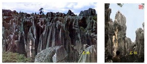 成片裸露、巖層厚度大的可溶性巖石節(jié)理裂隙和層面受地表水溶蝕、侵蝕,使巖石表面形成溝槽形態(tài),凹槽稱為喀斯特溶溝,溝槽間的突起稱為石芽。在熱帶、亞熱帶地區(qū),水熱條件充沛,水的溶蝕性強(qiáng),石芽在強(qiáng)烈的巖溶作用下生成一種特殊形態(tài),形體高大,石芽之間的溶溝很深,溝坡垂直,坡壁上刻有平行垂直的凹槽,即石林。這類喀斯特景觀的典型代表是著名的云南路南石林,石林相對(duì)高度一般