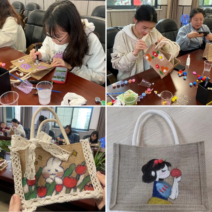 活動中,大家紛紛拿出畫筆,發(fā)揮自己的想象力將亞麻袋繪畫、裝飾成不同風(fēng)格。同學(xué)們互相欣賞對方的“絕美畫作”,贊不絕口,現(xiàn)場彌漫著青春陽光的氣息,氣氛歡快融洽。