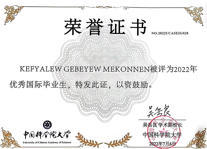 近日,中國科學(xué)院大學(xué)公布了“2022年度優(yōu)秀國際學(xué)生和優(yōu)秀國際畢業(yè)生”,中國科學(xué)院亞熱帶農(nóng)業(yè)生態(tài)研究所2022屆畢業(yè)生KEFYALEW GEBEYEW MEKONNEN(中文名:強(qiáng)大)榮獲“優(yōu)秀國際畢業(yè)生”榮譽(yù)稱號。